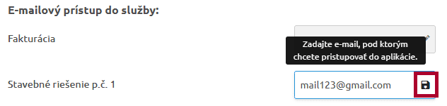 Po kliknutí na ceruzku pri „Stavebné riešenie p.č….“ zadáte Vašu e-mailovú adresu, pod ktorou sa budete prihlasovať do jednotlivých stavebných aplikácií. Ak balík obsahuje aj ekonomické aplikácie, zadáte mailovú adresu aj pre tieto aplikácie. Odporúčame používať rovnakú mailovú adresu pre všetky aplikácie a využívať tak ich prepojenosť.