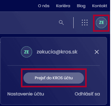 Po prihlásení budete presmerovaný na hlavnú stránku www.kros.sk. V pravej časti uvidíte „medailónik“ s vašimi iniciálami. Po rozbalení zvoľte Prejsť do KROS účtu.