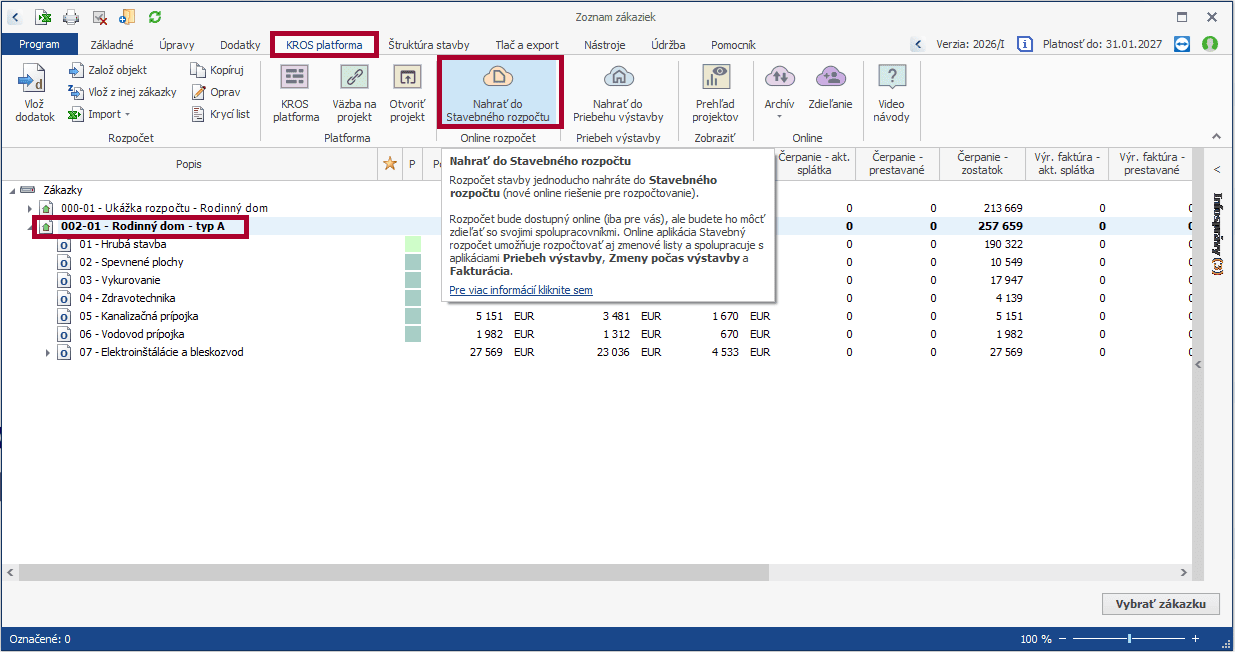 Program Rozpočty a kalkulácie CENKROS 4 v najnovšej verzii umožňuje nahratie stavby do online aplikácie KROS Stavebný rozpočet s možnosťou ďalšej úpravy.
