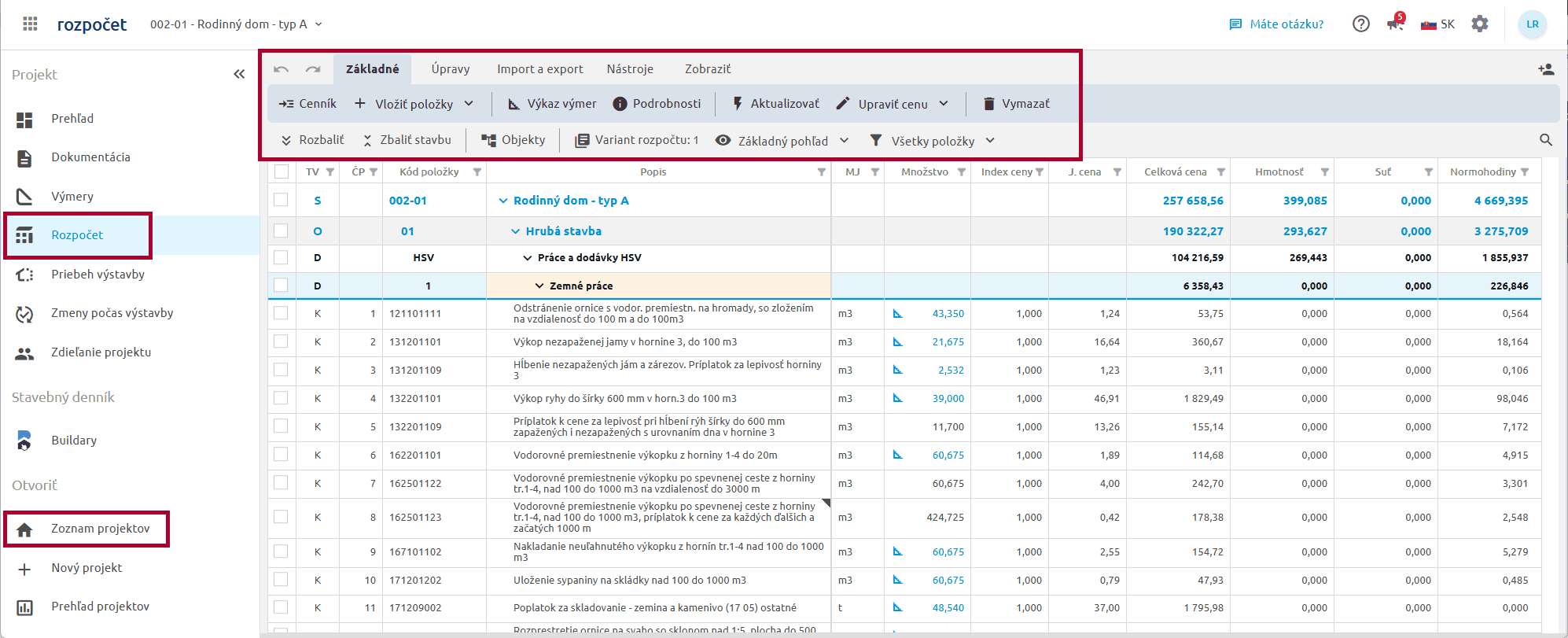 Pre prácu v aplikácií využite ikony v hornom menu. Všetky projekty / stavby v KROS platforme viete zobraziť cez možnosť „Zoznam projektov“ v ľavom menu.