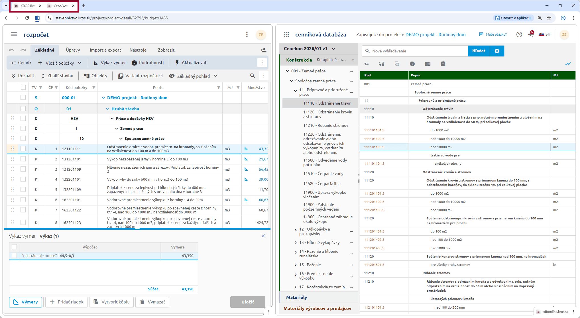 Niektoré prehliadač ako Google Chrome alebo Opera umožňujú v rámci jedného okna zobraziť 2 karty. Táto funkcia je užitočná pri zápise položiek z Cenníkovej databázy do aplikácie KROS Stavebný rozpočet.
