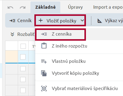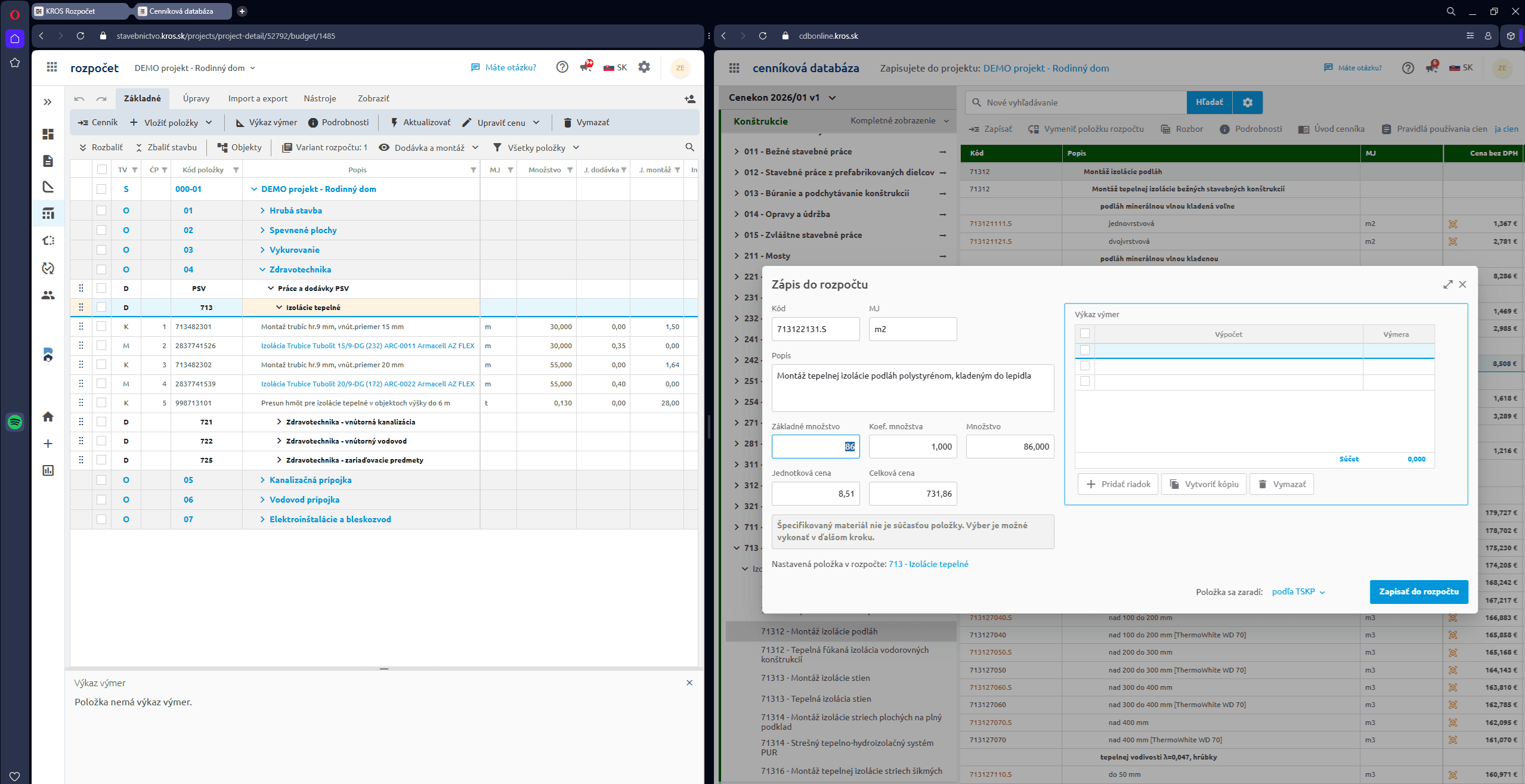 V prehliadači Google Chrome alebo Opera si otvorte stavbu v aplikácií KROS Stavebný rozpočet. Následne pomocou funkcie „Vložiť položky / Z cenníka“ otvorte Cenníkovú databázu, ktorá sa zobrazí na druhej karte.