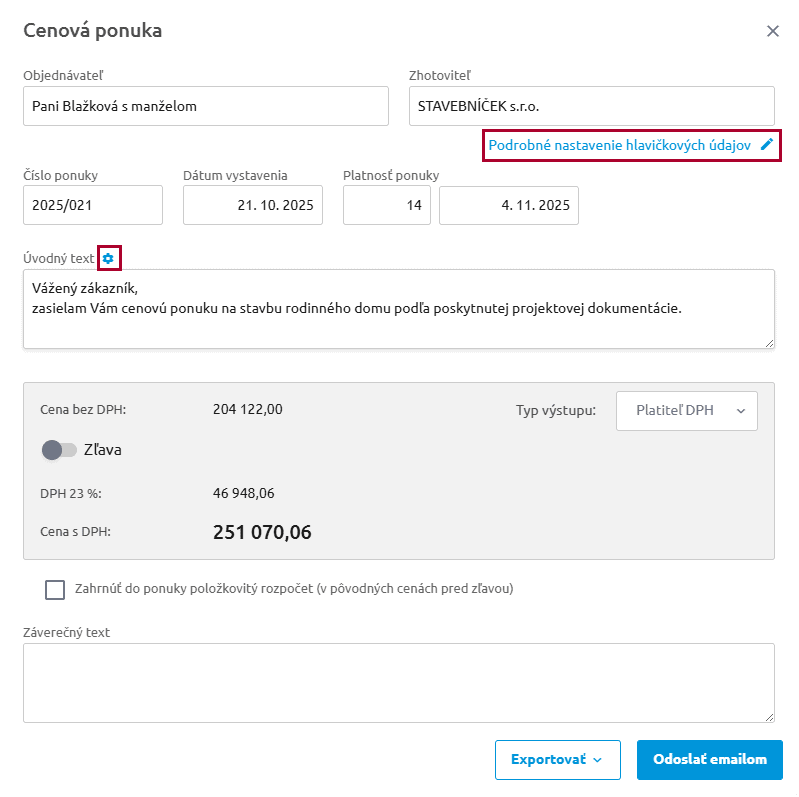Pri exporte cenovej ponuky je potrebné najskôr vyplniť údaje, ktoré chcete mať súčasťou výstupu.