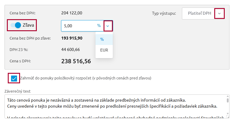 - Môžete definovať zľavu z celkovej ceny vyjadrenú v % alebo v EUR.