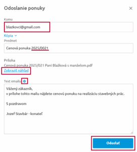 Ešte pred odoslaním mailu si viete zobraziť náhľad cenovej ponuky a všetko skontrolovať. Rovnako si viete cez ozubené koliesko vytvoriť a opakovane využívať preddefinovaný text emailu.