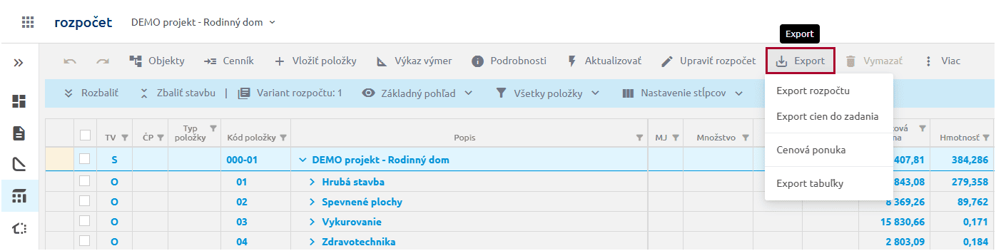 V okne rozpočtu je na paneli nástrojov dostupná funkcia „Export „, ktorá ponúka hneď niekoľko možností exportu.