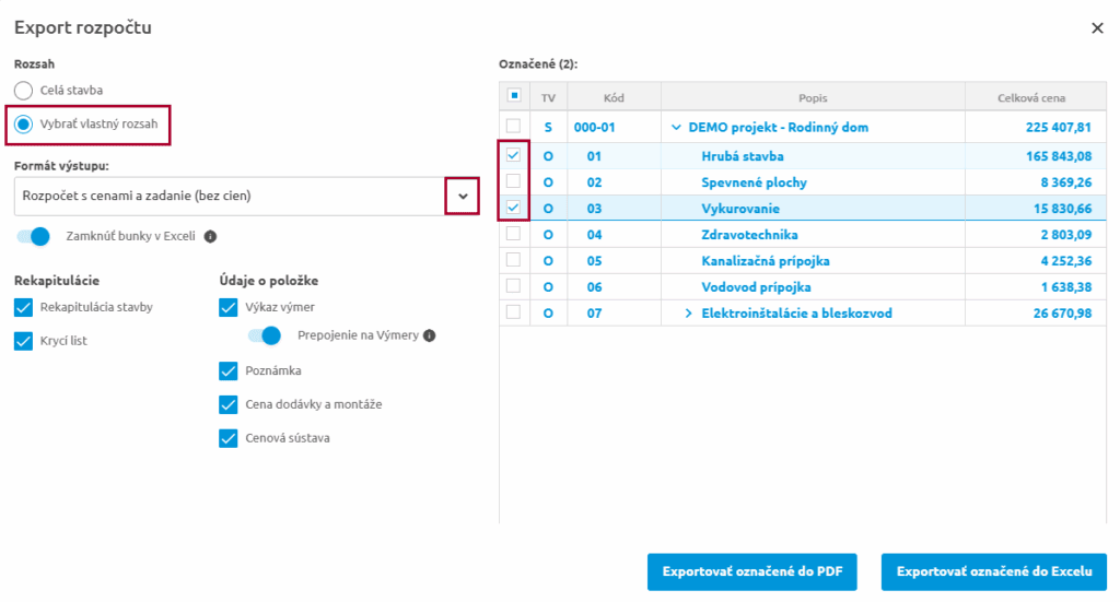 - Rozsah exportu – je možný za celú stavbu, alebo si urobiť vlastný výber za označené objekty.