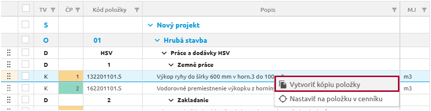 TIP: Kópiu položky vytvoríte ešte jednoduchšie kliknutím pravého tlačidla myšky nad požadovanou položkou v tabuľke rozpočtu a výberom možnosti Vytvoriť kópiu položky.