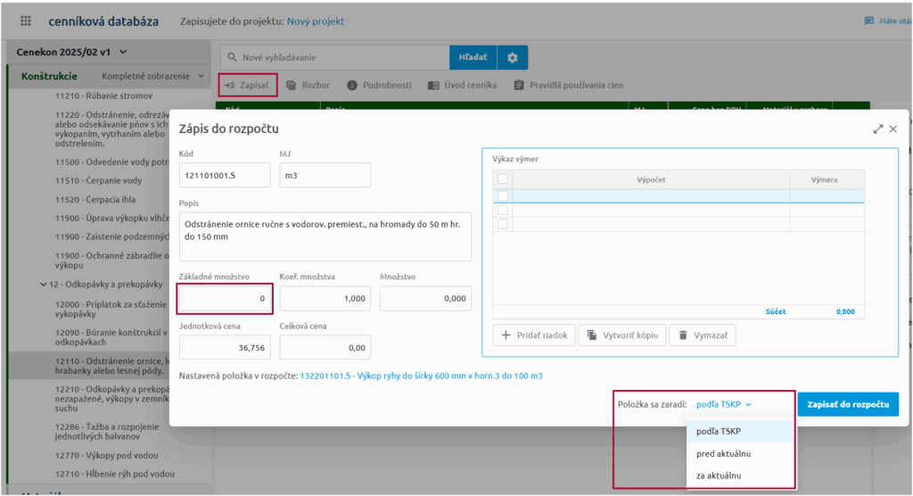 Pri Konštrukciách je možné položku pridať aj s dielmi, ak zvolíte zaradenie podľa TSKP pohľadu. Na výber je tiež zaradenie do dielu, ak v rozpočte stojíte na diele alebo ak stojíte na položke, tak zaradenie za aktuálnu alebo pred aktuálnu položku.