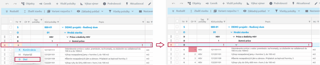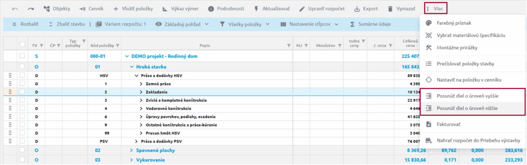- Posunúť diel o úroveň vyššie – aktuálny diel sa posunie na úroveň nadriadeného dielu a v tabuľke rozpočtu sa zaradí za daný diel.