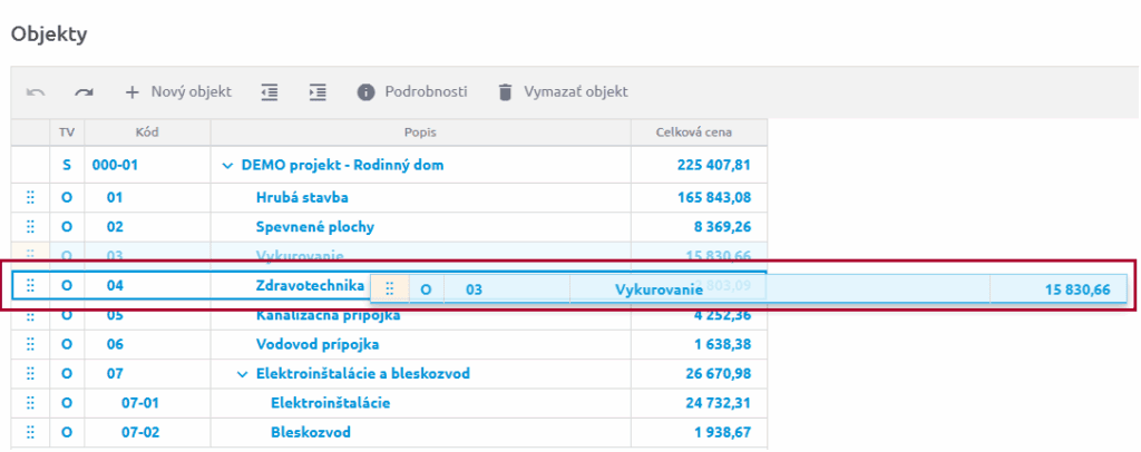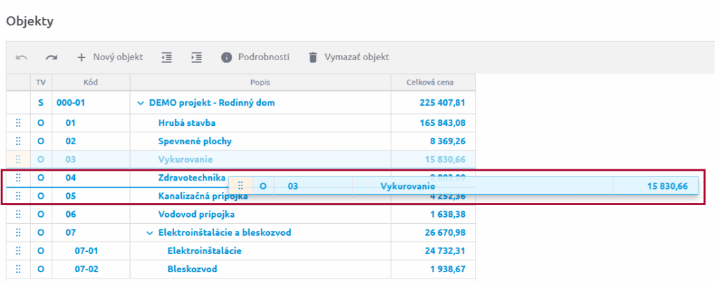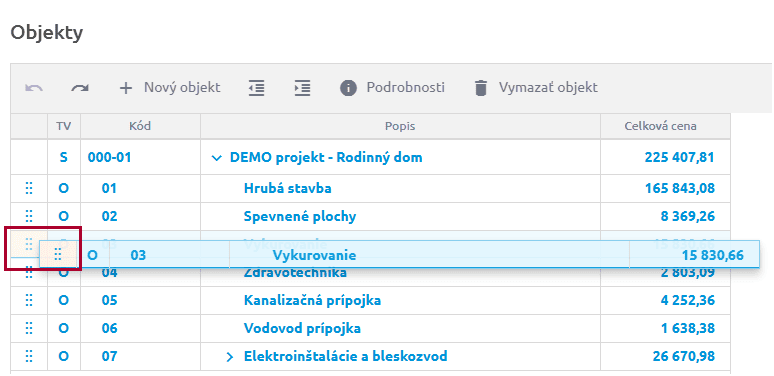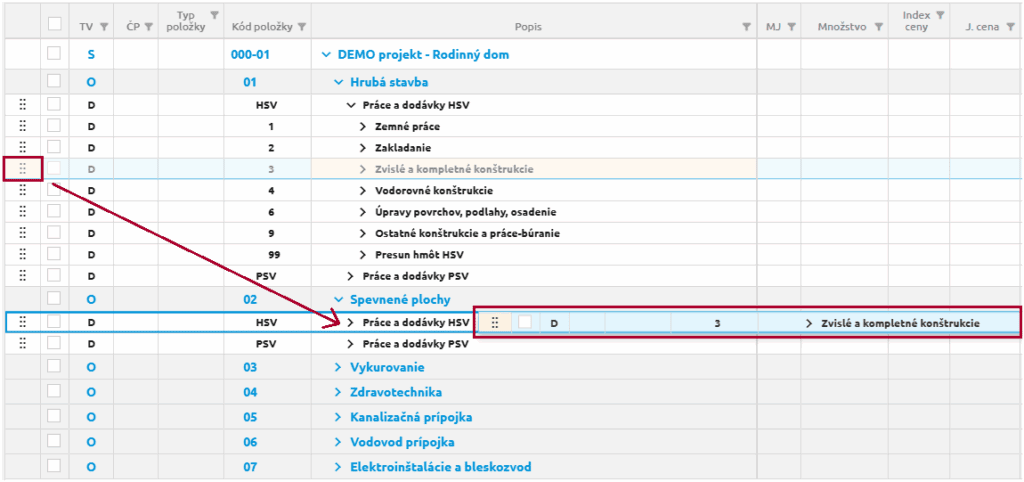 Stačí sa kurzorom nastaviť na bunku 6-bodiek toho objektu, ktorý chcete presunúť alebo mu zmeniť úroveň a stlačením a potiahnutím ho presuniete na požadovanú pozíciu v štruktúre rozpočtu.