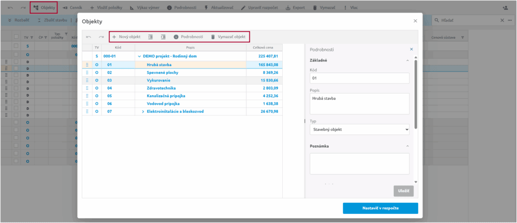 Okrem tvorby nového objektu a výmazu existujúceho objektu môžete meniť aj úroveň objektov v rámci štruktúry rozpočtu.