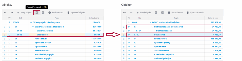 - Pomocou funkcie „Presuň o úroveň nižšie“ sa zase objekt na rovnakej úrovni s predchádzajúcim objektom stane jeho podriadeným a teda aj sumár celkovej ceny, hmotnosti, sute a normohodín podriadeného objektu sa bude započítavať do celkového sumáru nadriadeného objektu.