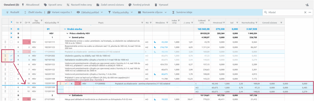 Presúvanie položiek v rozpočte môžete robiť individuálne po položkách, ale aj hromadne za označené položky. Využijete na to rovnakú ikonku 6 bodiek v ľavej časti tabuľky rozpočtu.