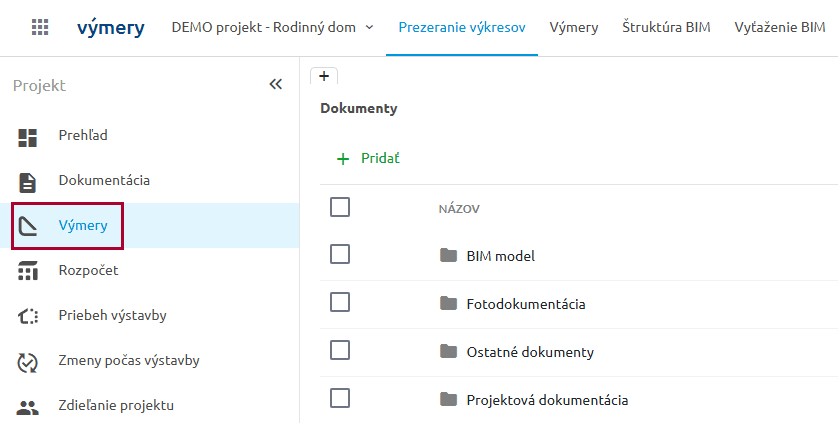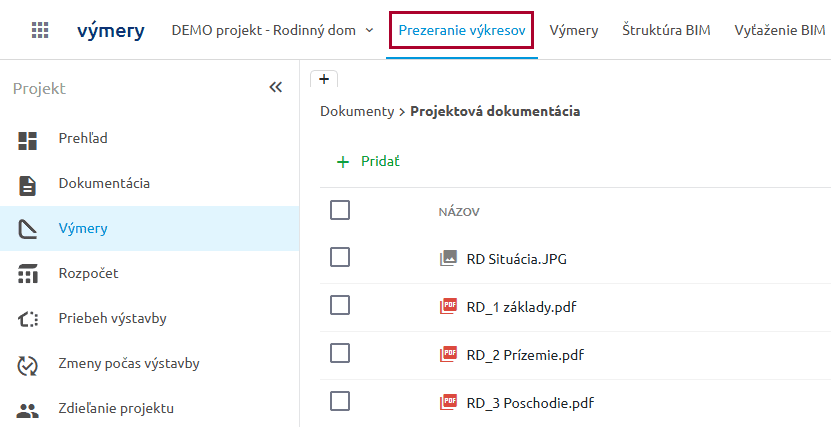Ak chcete pridať ďalší dokument do projektu, spravíte to jednoducho cez + Pridať nad zoznamom dokumentov. Pri zmenách projektovej dokumentácie môžete nahrať nové verzie dokumentov cez. Existujúce merania a výkazy výmer sa prenesú do novšej verzie výkresu. Vedľa názvu súboru sa zobrazí informácia, koľko verzií výkresu bolo nahraných.