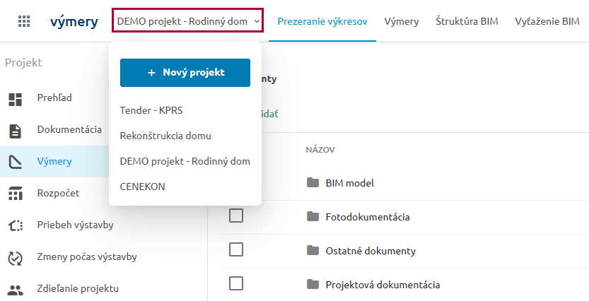 V hornej lište je zobrazený názov projektu, ktorý máte otvorený. Po kliknutí naň sa zobrazí menu, v ktorom môžete založiť nový projekt cez „+ Nový projekt“ alebo vybrať existujúci.