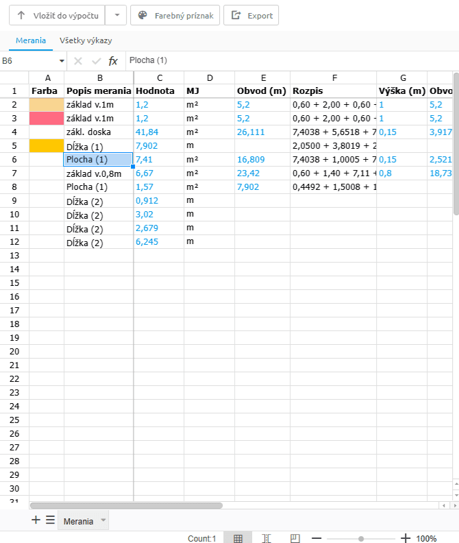- Stĺpce Obvod*výška (m2) a Plocha*výška (m3), nie sú editovateľné.