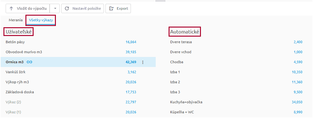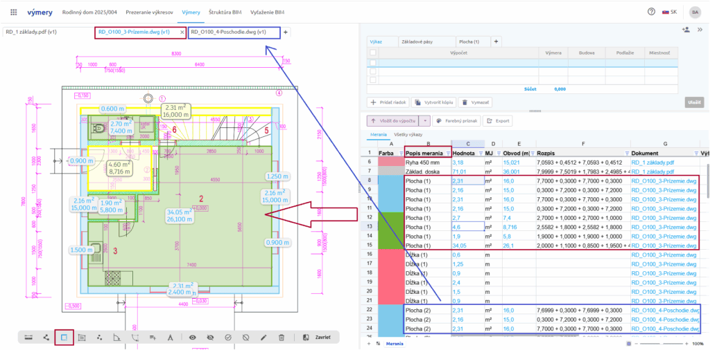 - Merania sa vo výkaze výmer zobrazujú modrou farbou. Klikom na modrú hodnotu vo výkaze výmer vás aplikácia automaticky nastaví na príslušné meranie v tabuľke meraní a aj vo výkrese. Ak výkres ešte nie je zobrazený, tak sa automaticky otvorí.