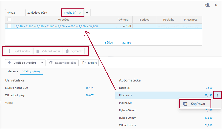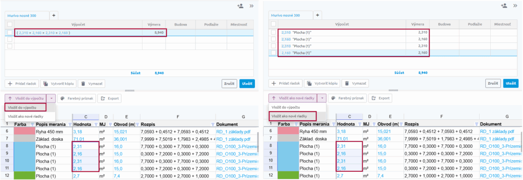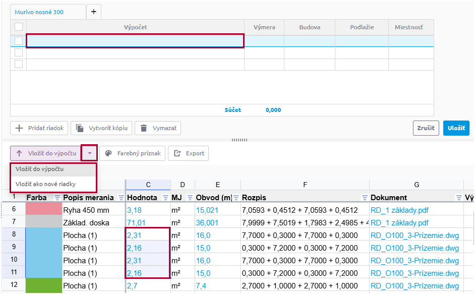 - Do aktuálneho riadku výkazu výmer vložíte meranie tak, že sa naň postavíte v tabuľke meraní a stlačíte tlačidlo s jednou z možností Vložiť do výpočtu/Vložiť ako nové riadky.