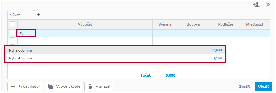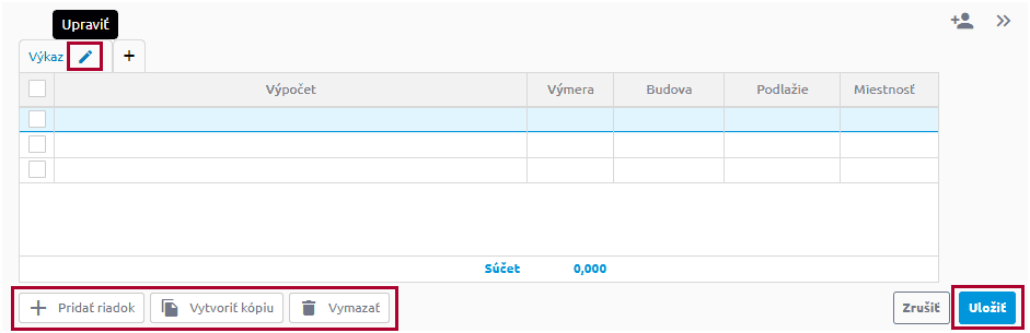 - V tabuľke výkazu výmer môžete riadky editovať, pridať, kopírovať a vymazať.