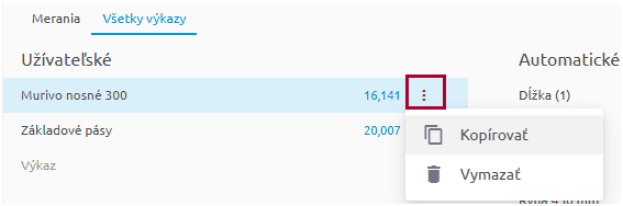 - Výkazy automaticky generované z meraní sú needitovateľné. Editovať ich je možné úpravou alebo výmazom merania priamo na výkrese alebo výmazom v tabuľke meraní.