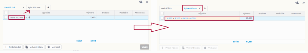 - Ak je meranie použité vo výkaze výmer a vymažete ho z tabuľky meraní, tak sa v použitom výkaze výmer nahradí editovateľnou hodnotou bez prepojenia na meranie.