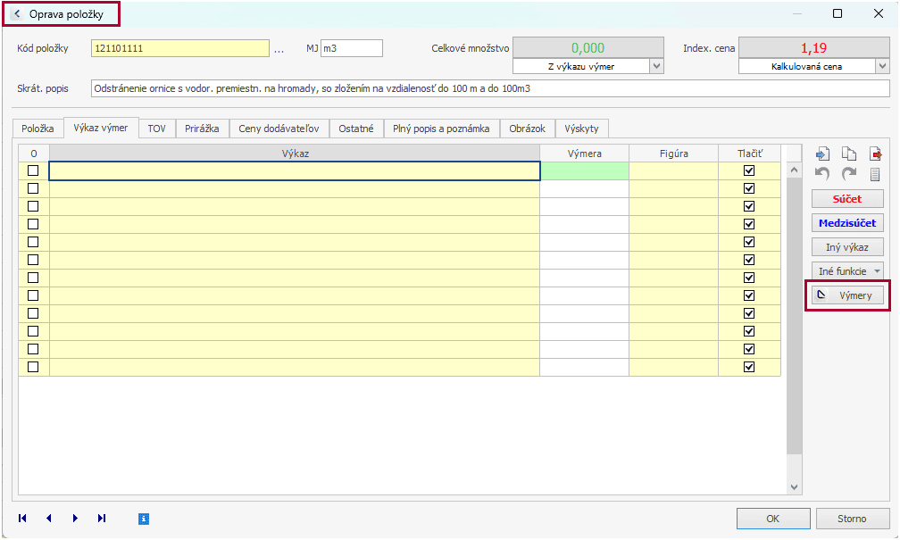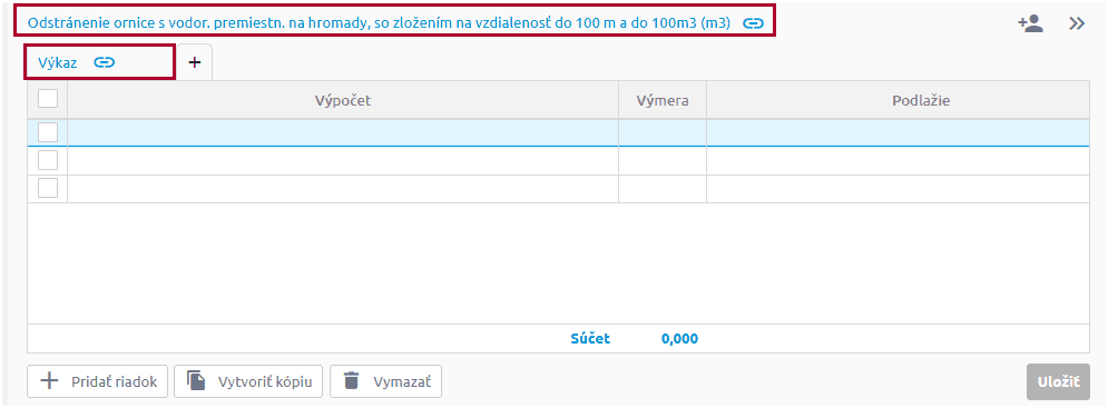 Ak položka ešte nemá priradený výkaz z aplikácie Výmery, tak budete nastavený na prázdny výkaz, nad ktorým bude zobrazený názov aktuálnej položky rozpočtu, ku ktorej budete výkaz výmer tvoriť.