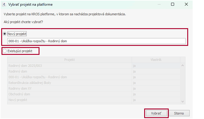 Pri prvom spustení aplikácie Výmery je potrebné previazať stavbu s projektom na KROS platforme.