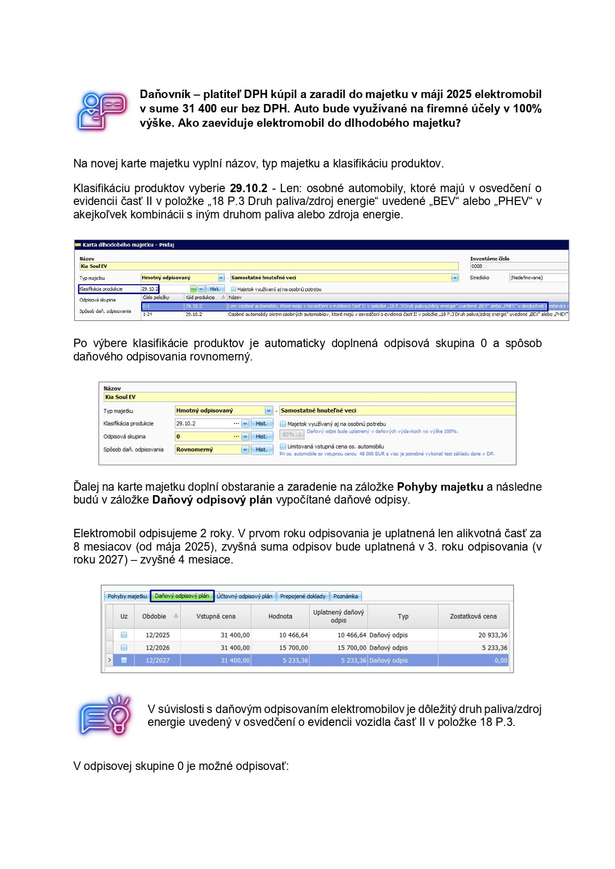 Overte si v e-booku, aké sú pravidlá pri odpisovaní majetku v špecifických situáciách. Posvietime si na majetok u mikrodaňovníka, odpisovanie luxusných automobilov, elektromobilov alebo majetku, ktorý je využívaný aj na osobnú potrebu.
