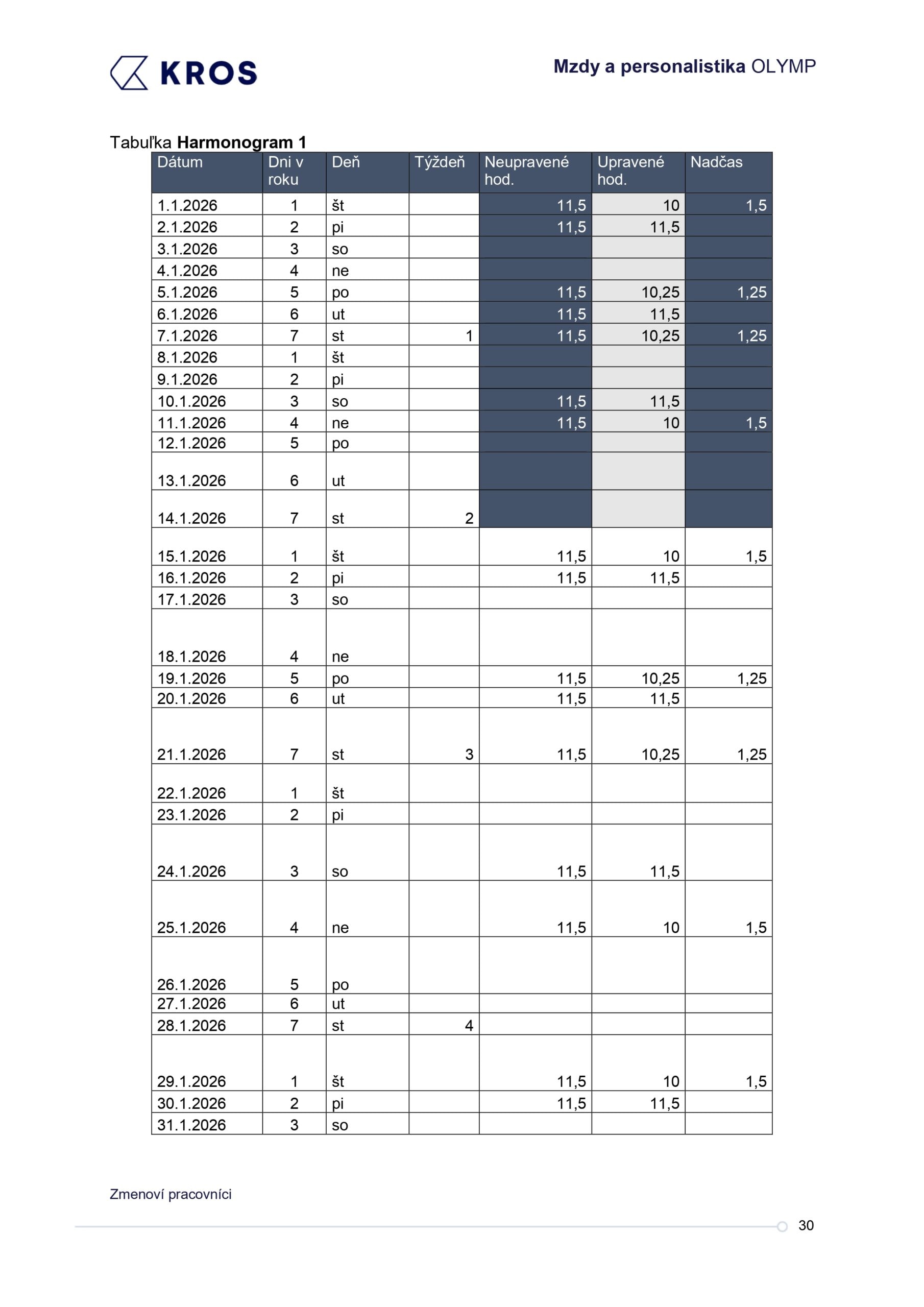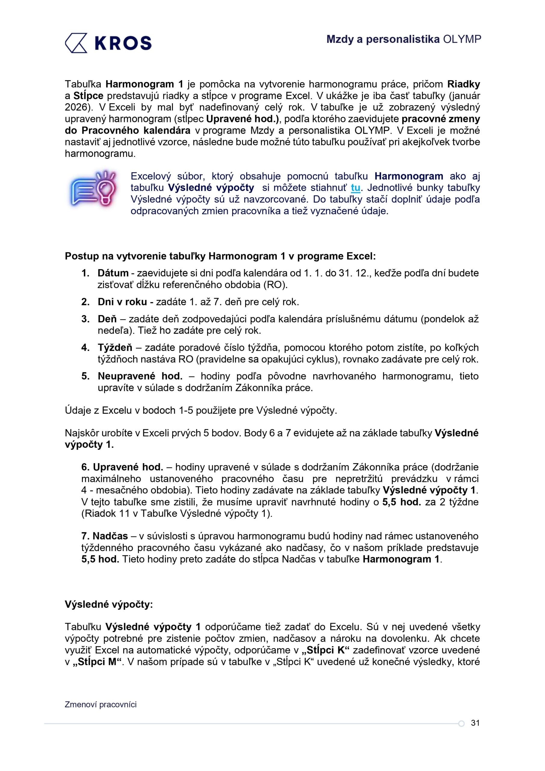 Okrem toho v ňom nájdete aj kapitolu o dochádzkovom systéme KROS Dochádzka. Táto aplikácia Vám uľahčí prácu pri plánovaní zmien zamestnancom, odsleduje za Vás dodržiavanie časového fondu vo vyrovnávajúcom období. Jednou z jej výhod je aj priame prepojenie s programom Mzdy a personalistika OLYMP.